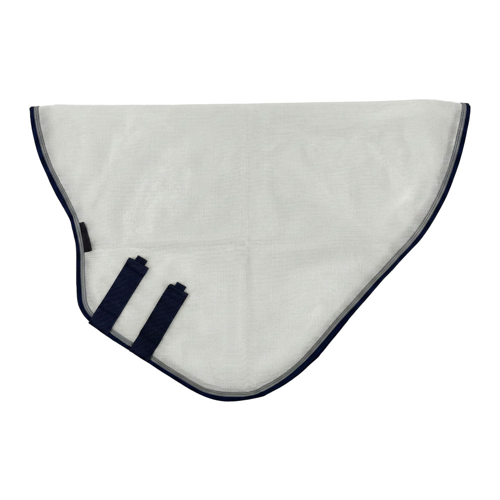 「Equi-Themere アンチUVメッシュフライシート」用のネックカバー。100%PVCメッシュ素材を使用した、通気性と耐久性の高いネックカバーです。PVCにUVカット加工素材が練りこまれた特殊なポリエステルメッシュ生地はハリのある質感で、表面はつるっとなめらか。しっかりとした耐久性を保ちながら優れた通気性を実現し、虫や紫外線から快適に馬を保護します。また水に強く、繊維に汚れが染み込みにくいので丸洗いしても乾きやすいのもポイントです。