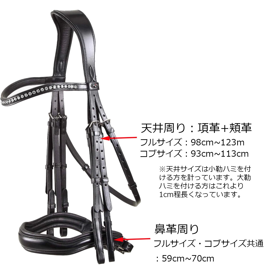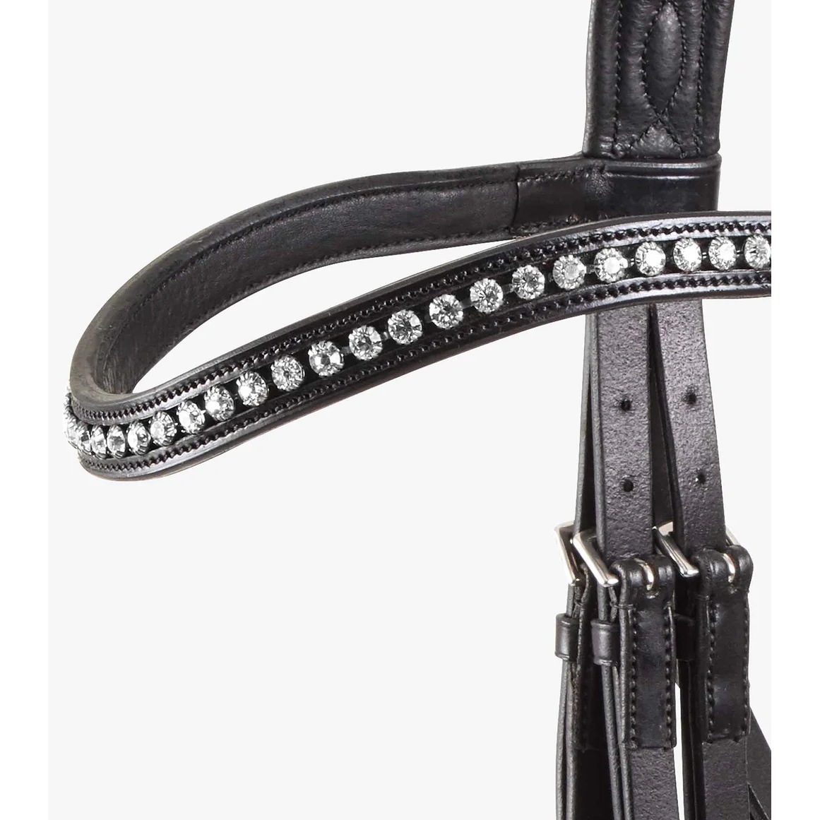 またエレガントなカーブを描く額革には一列に並んだ煌めくラウンドカットのダイヤモンド風ストーンが施され、華やかさと高級感を際立たせています。トレーニングにでも競技会でも美しさとパフォーマンスを引き出す頭絡です。