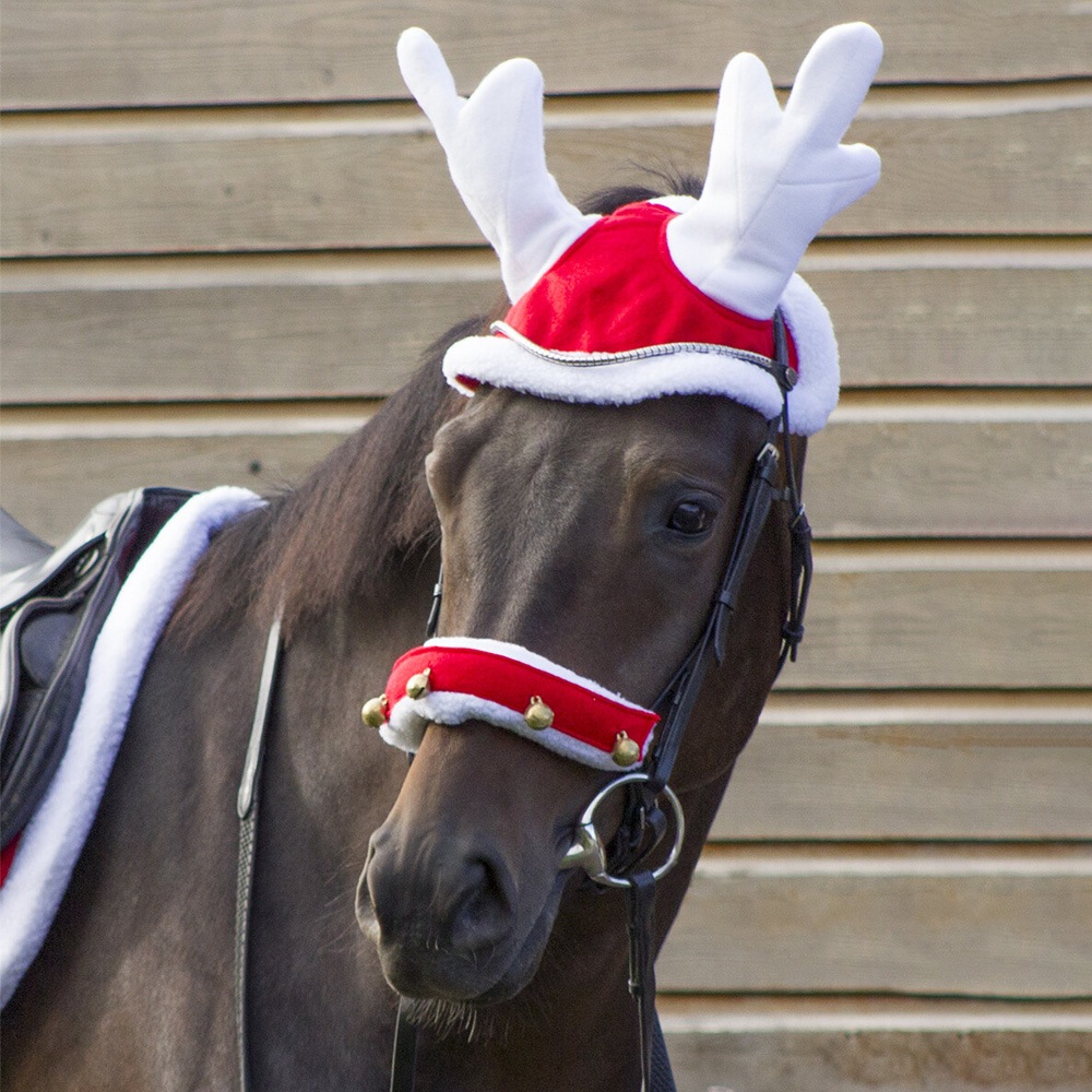 白いツノとふわふわファーがとびきりキュートな、馬用トナカイハットです。